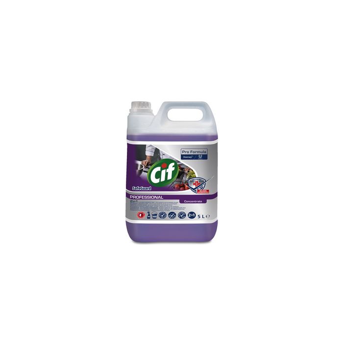 Cif Nettoyant désinfectant concentré 2in1 Professional, 5 L produit combiné pour le nettoyage et la désinfection en mêmetemps, élimine les salissures et restes d'aliments, grand pouvoir nettoyant, efficace contre un grand nombre de micro-organismes, sans parfums (7517738) 5 litres, le concentré, s'il est non dilué, a un effet virucide limité utiliser les biocides avec précaution - lire toujours l' étiquetage et les informations sur le produit avant utilisa-tion