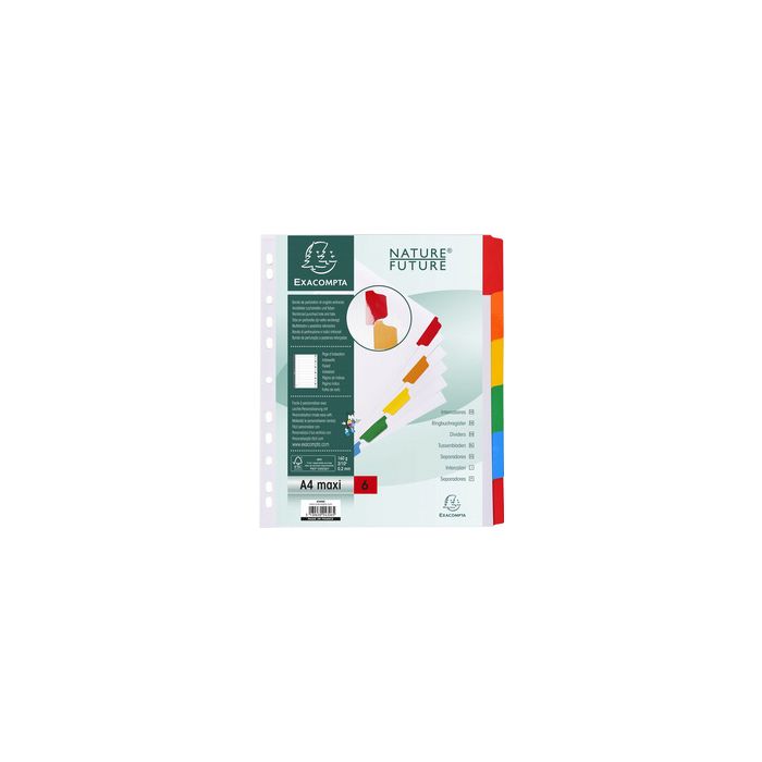 EXACOMPTA Intercalaires en carton, A4 Maxi, 6 touches carte blanche 160 g/m2, uni, touches colorées plastifiées, bande de perforation renforcée, page d'indexation imprimableen paquet de 20 pièces (4306E)