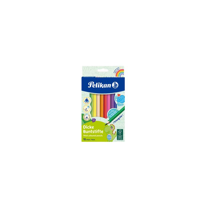 Pelikan Crayons de couleur épais, étui en carton de 12 longueur:175mm, épaisseur de mine: 4,0mm, couleurs assortiescontenu: 12 pièces (nouveau: 100401616 / ancien: 724039 / BSD12DN) assorti dans les couleurs jaune, rouge, 4 teintes rouges, violet, bleu ciel, vert clair, vert, marron et noir forme triangulaire