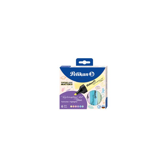 Pelikan Surligneur 490 Pastel, étui de 6, couleurs assortiesencre universelle à base d'eau, pointe biseautée pour écrireen 3 largeurs de trait, avec zone de préhension, capuchon Twist-Off, largeur de tracé : 1,0 à 5,0 mm contenu : 6 pièces (nouveau: 100436031 / ancien: 817325) assorti dans les couleurs jaune clair, vert prairie, rose clair, orange pâle, lavande et turquoise