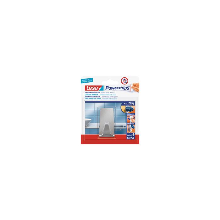 tesa Powerstrips Crochet adhésif LARGE, métal, rectangulaireréutilisable, capacité de charge maximale 2,0 kg, acier inoxydable brossé, fixation simple sans vis, clou ou cheville, contenu: 1 crochet et 4 languettes LARGE (58266-00000-20)
