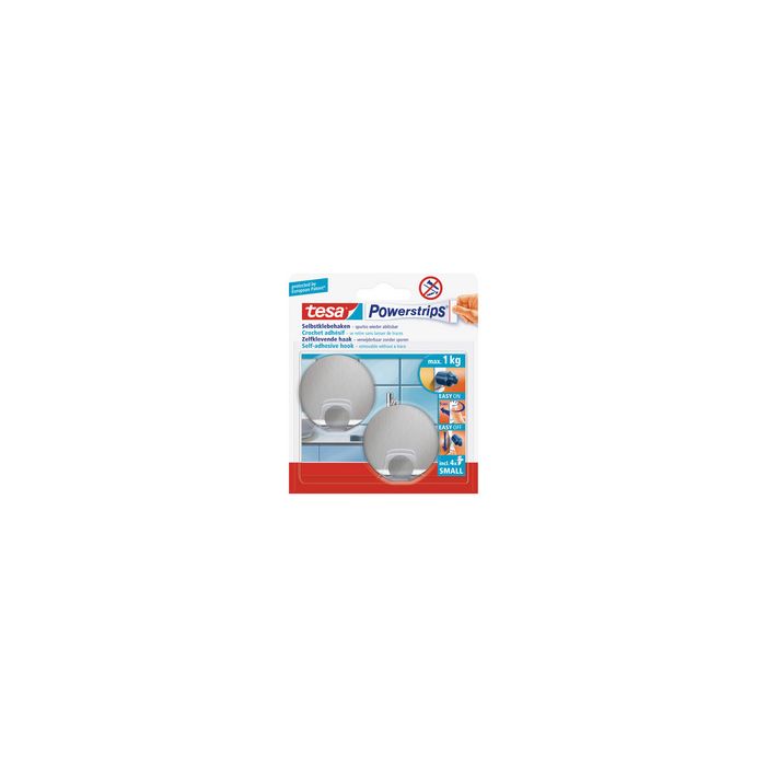 tesa Powerstrips Crochet adhésif SMALL, métal, rond réutilisable, capacité de charge maximale 1,0 kg, acier inoxydable brossé, fixation simple sans vis, clou ou cheville, contenu: 2 crochets et 4 languettes small (57044-00000-20)