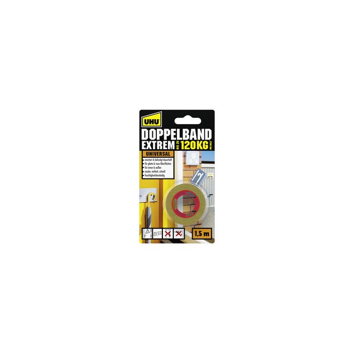 UHU Ruban adhésif de montage EXTREM, double face jusqu'à 120 kg, ruban très robuste pour surfaces lisses et rugueuses, intérieur & extérieur, résistant à l'humidité, résistant à la charge après 60 minutes, couleur: beige dimensions: (l)19 mm x (L)1,5 m (46820)